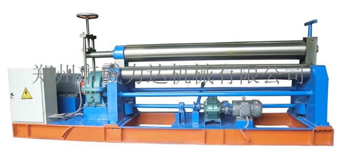 該機(jī)為對稱式三輥卷板機(jī),兩下輥為主動固定輥,上輥通過升降絲桿、渦輪、蝸桿在兩下輥對稱中央作上下移動,兩下輥的左、右旋轉(zhuǎn)和上輥的升降移動均靠電機(jī)帶動減速器來完成,并能借助手動離合器把上輥調(diào)節(jié)成平行或傾斜位置,以適應(yīng)卷制圓形和錐形工件的需要,渦輪上下配有特種壓力軸承,轉(zhuǎn)動輕松、省電耐磨。該機(jī)集機(jī)身、傳動、電器部分為一整體,其結(jié)構(gòu)緊湊、操作方便、便于搬運、安裝和維護(hù)。